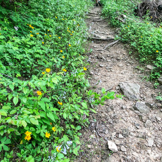 About 2 miles in we ran into a bit of an obstacle where there used to be a scenic foot bridge crossing the Fall Branch creek. This bridge was also wiped out by the floods and is currently impassable. The trail is blocked with caution tape and a detour sign, though the path of detour is not overly clear. We ended up walking along the creek bank for a short bit unsure of where to go before we noticed a trail on the opposite side of the river with a tree marked with a red cloth. You have to make your way down the river bank and then rock hop across the creek to the opposite side and then back up the river bank. We were able to do this relatively easily with our water proof hiking boots, but I've heard the path is impassable after heavy rainfalls/flooding.